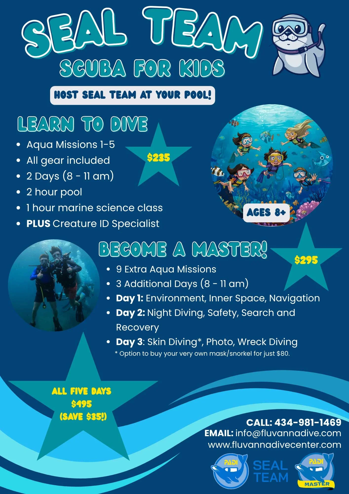Beyond learning basic scuba skills, there are specialty AquaMissions, such as wreck diving, navigation, buoyancy, environmental awareness and more. To join the PADI Seal Team, a child must be 8 years of age or older. No prior experience with scuba diving is necessary, but kids should be comfortable in the water.